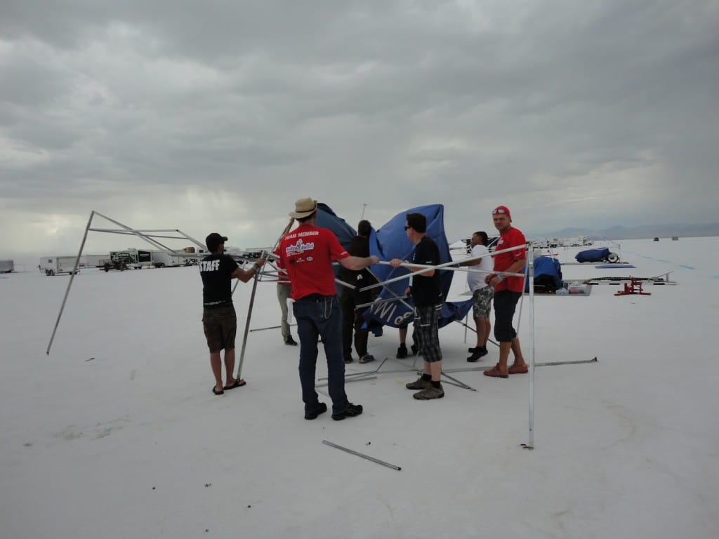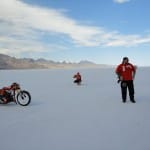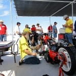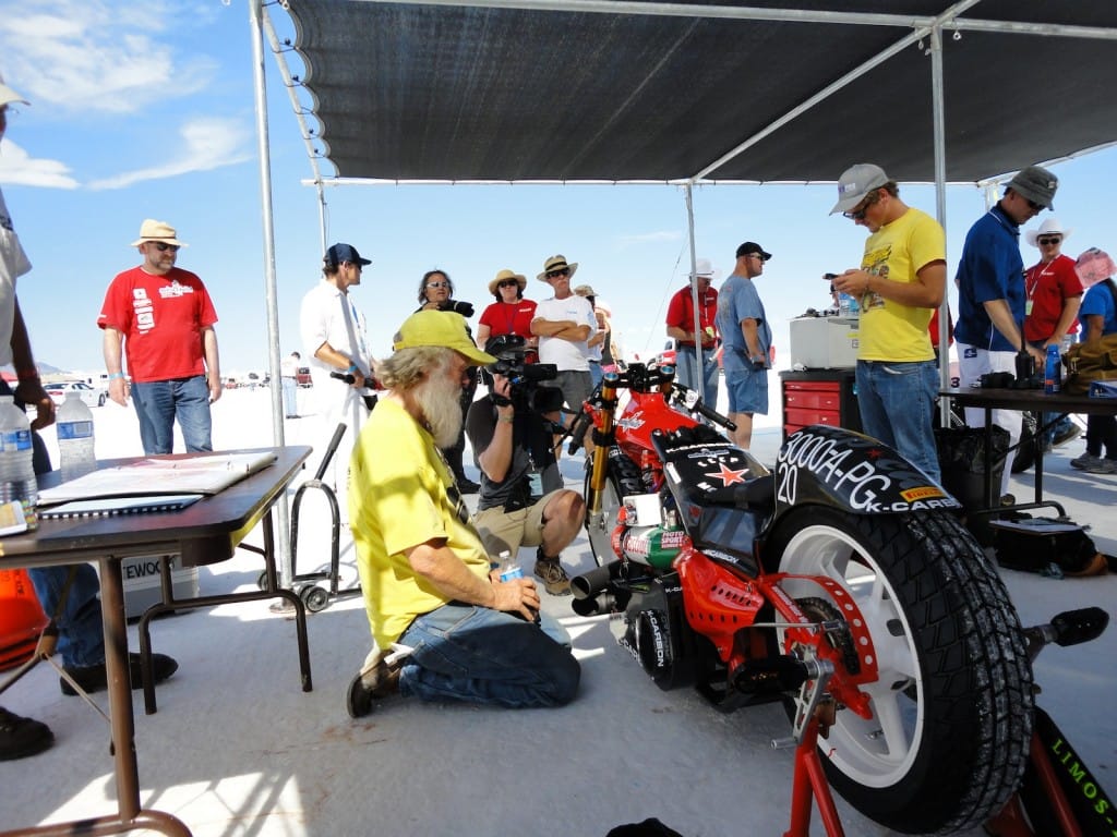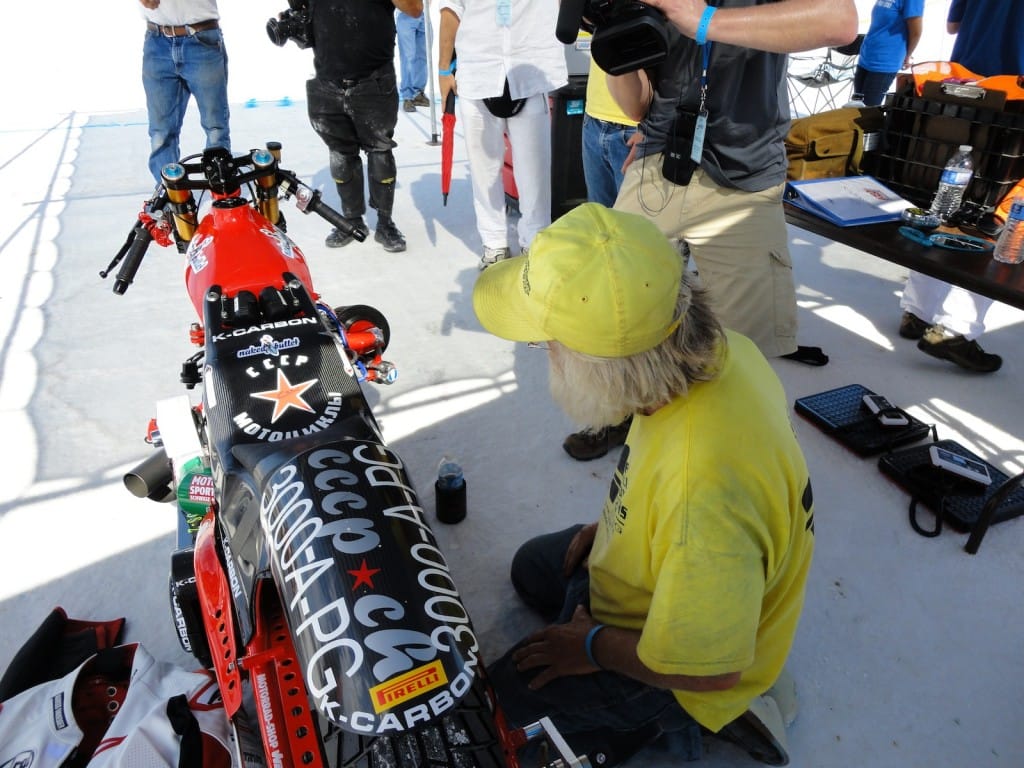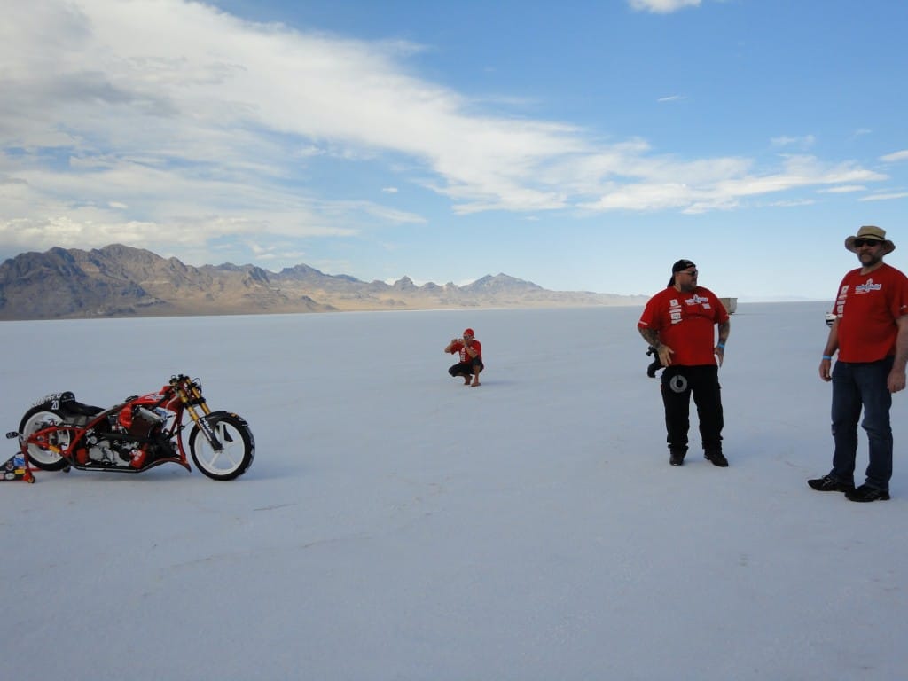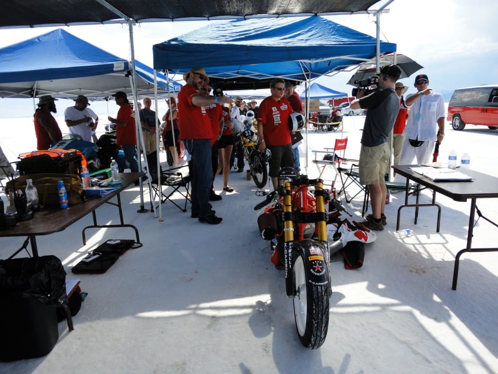 The day of decision. Today the technical inspection is on the agenda. But before that happens, we still had to pick up the U-haul (small truck for the race bike). And there we were ready by 9 clock and it worked after all. In a convoy we drove to the place where they put the box to be stored and were curious to find it ina  and were curious to see what was supplied in the box condition. People all clear, everything has arrived safely and as we drove by 12 clock finally to Bonneville Salt Flats to the. One thing I can say before, would anyone complain in Switzerland over 33 degrees, then I do not know what was out here today. There were around 45 degrees! After the campers,  the vehicles and the U-Haul were parked and placed it, our team worked like bees in the house. Everyone grabbed some stuff and in an instant all the material was unpacked. Together with Markus, I stood after in line at the pre-entry to be done, to place the forms for the technical inspection and to confirm the registration. After an hour it was done and now we had to take only the last hurdle. Here also was announced to be patience for a good two hours we were at the row. Drew, chief engineer FIM inspected the bike and found just three little things that need to be done by tomorrow, so it is allowed for the race. Meanwhile, Markus has took on the race suit so few photo sessions with the great light on the Salt Flats of Horst Roesler could be made yet. And then it started with the first ride – what a feeling, after driving up and down it could feel the power of it! Incidentally, it is not easy and it will not be a cakewalk for Markus. But that’s Bonneville, you have to earn it.